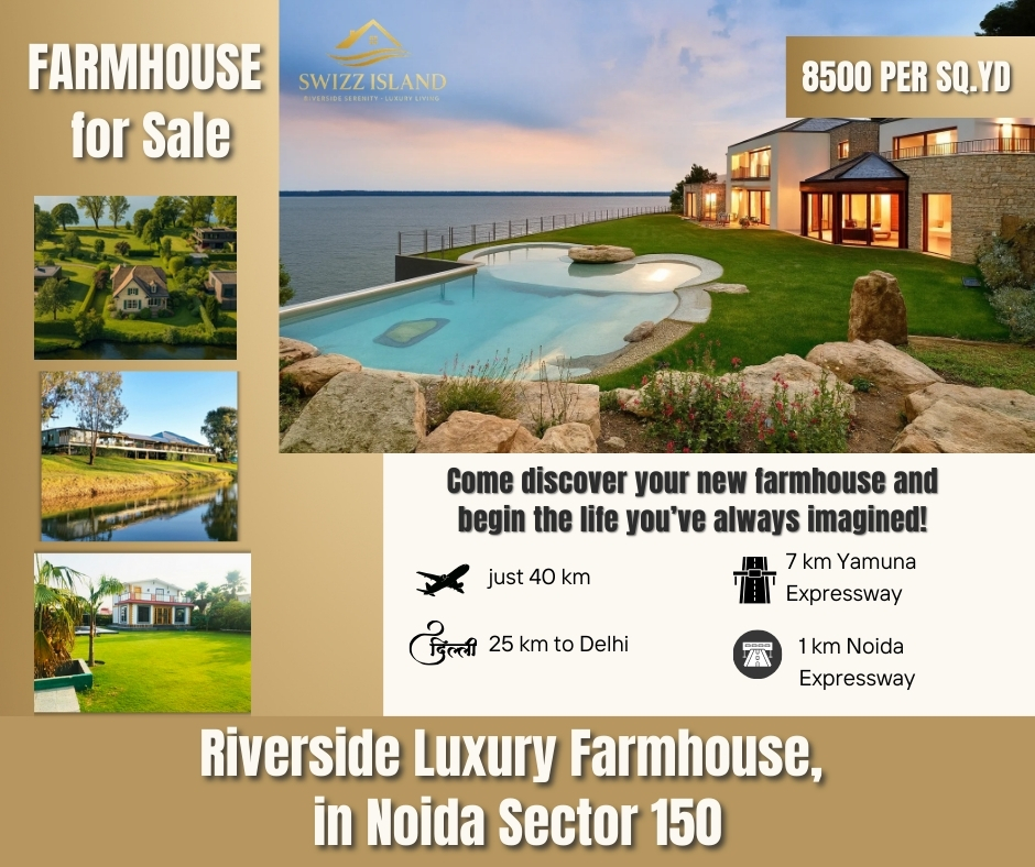 Swizz Island — premium riverside farmhouse plots in Noida Sector 150 (min 1008 Sq.Yd) offering luxury living, gated security and high-investment potential.